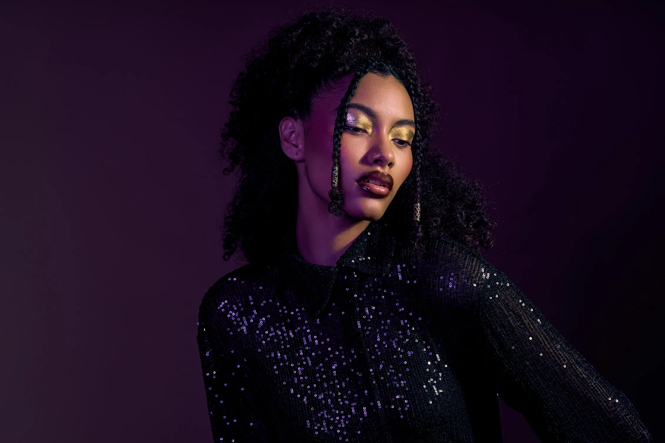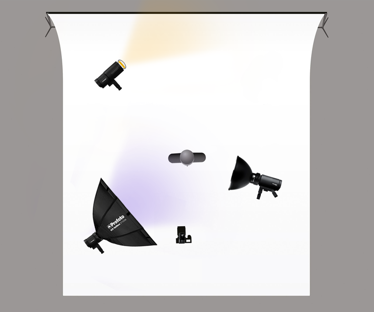 피부의 그림자 영역에 퍼플 톤을 입히기 위해, 저는 Profoto B10X Plus에 OCF Softbox Octa 3’와 컬러 젤을 추가하여 원하는 부드럽고 확산된 컬러 캐스트를 만들었습니다. 배경에는 Profoto B10X와 그리드, 그리고 CTO gel을 사용해 배경과 피부 톤의 색감을 조화롭게 통일시켰고, 이를 통해 모델의 얼굴에 집중된 구도를 완성했습니다.