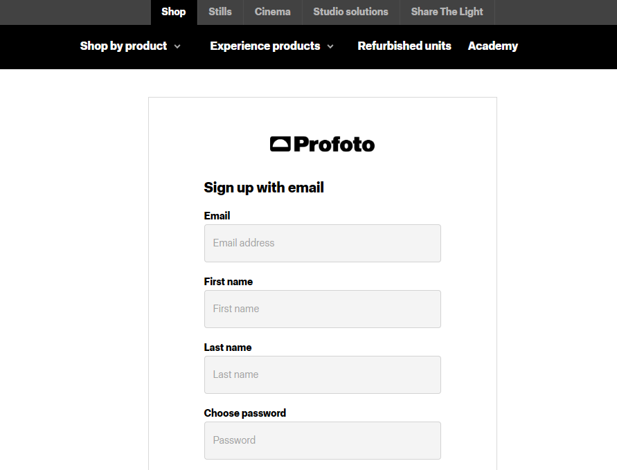 ① 우선 profoto.com(좌측 이미지 클릭)에 접속해 계정을 생성해야 합니다. 위 사이트의 우측 상단에 있는 'My Account'를 클릭한 후 흰색 'Sign Up' 버튼을 클릭해 신규 계정을 생성하는 창을 오픈합니다. 이후 계정 생성에 필요한 정보를 기입해 계정을 생성합니다.