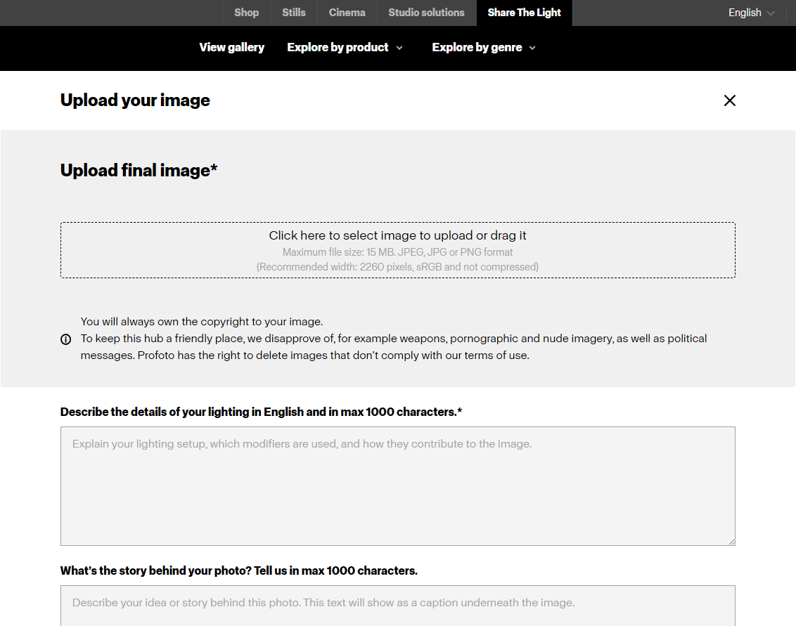 ④ 출품하고자 하는 이미지를 업로드합니다.(우측 이미지 클릭) 이와 더불어 출품하는 작품에 대한 정보와 내용, 사용하신 카메라와 Profoto 장비, BTS 이미지를 업로드합니다. 출품하는 작품의 장르까지 선택한 후 'Publish' 버튼을 눌러 출품을 완료합니다.